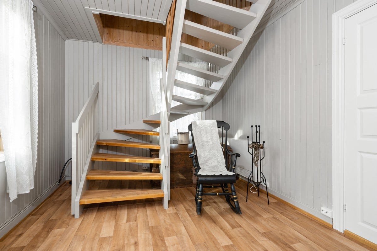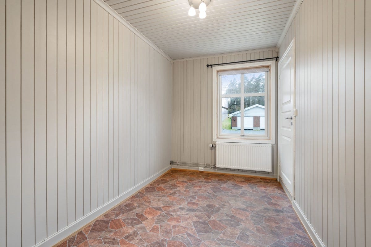 Finstue: Det er tapet på veggene og lakkerte tregulv. Malt strie i himling.
