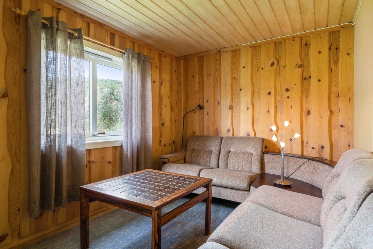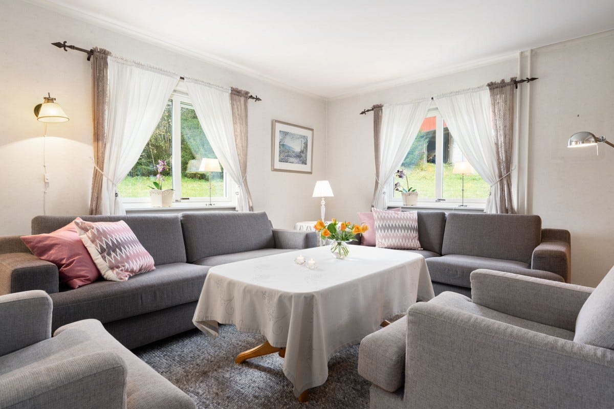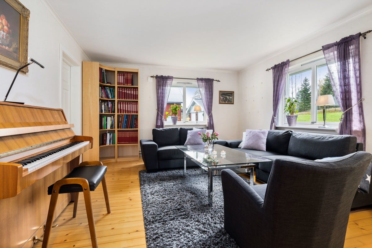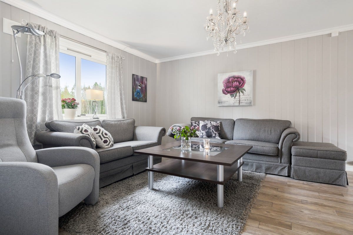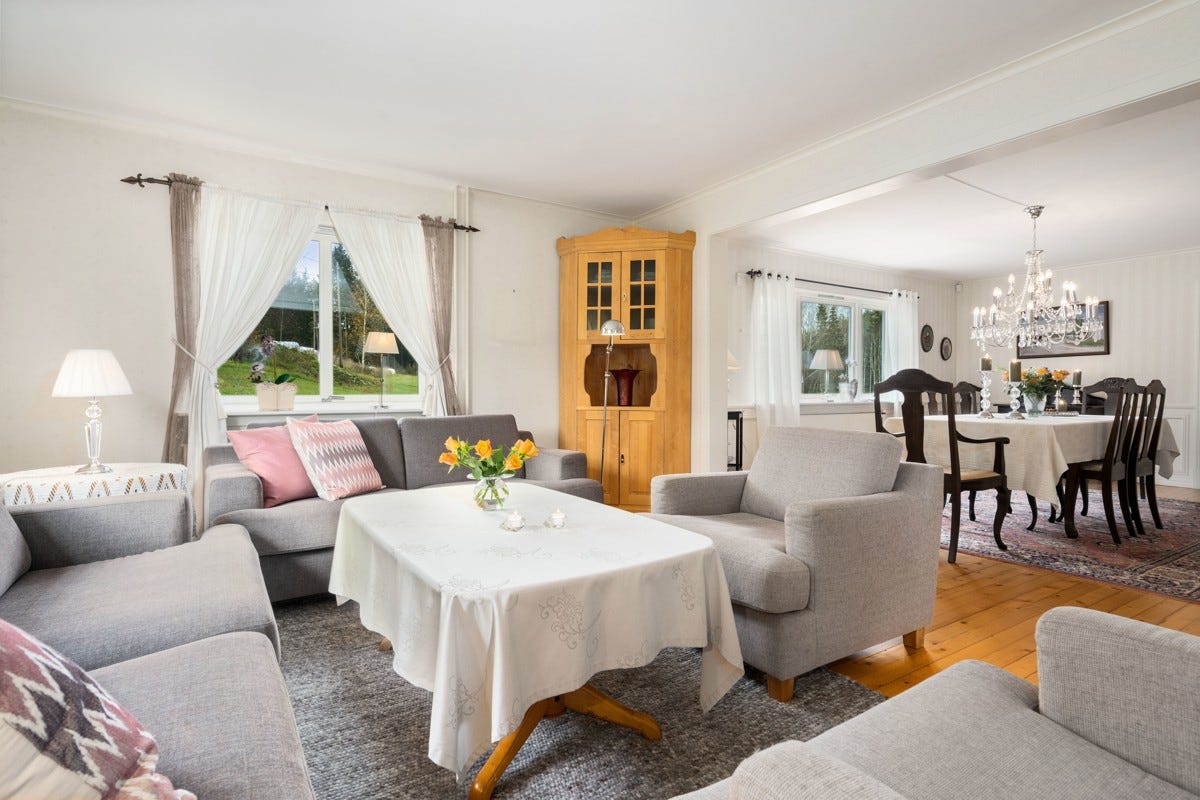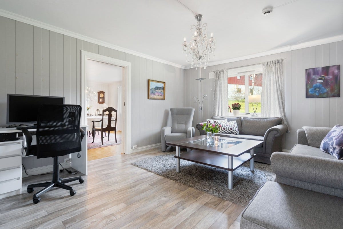 Stue: Det er panel på vegger og malte plater i himling. Det er belegg på gulvet. Stue ble pusset opp