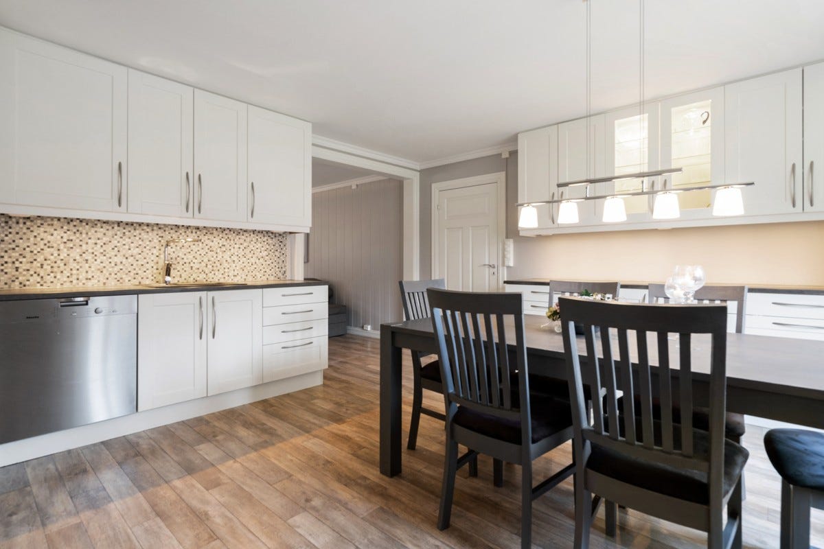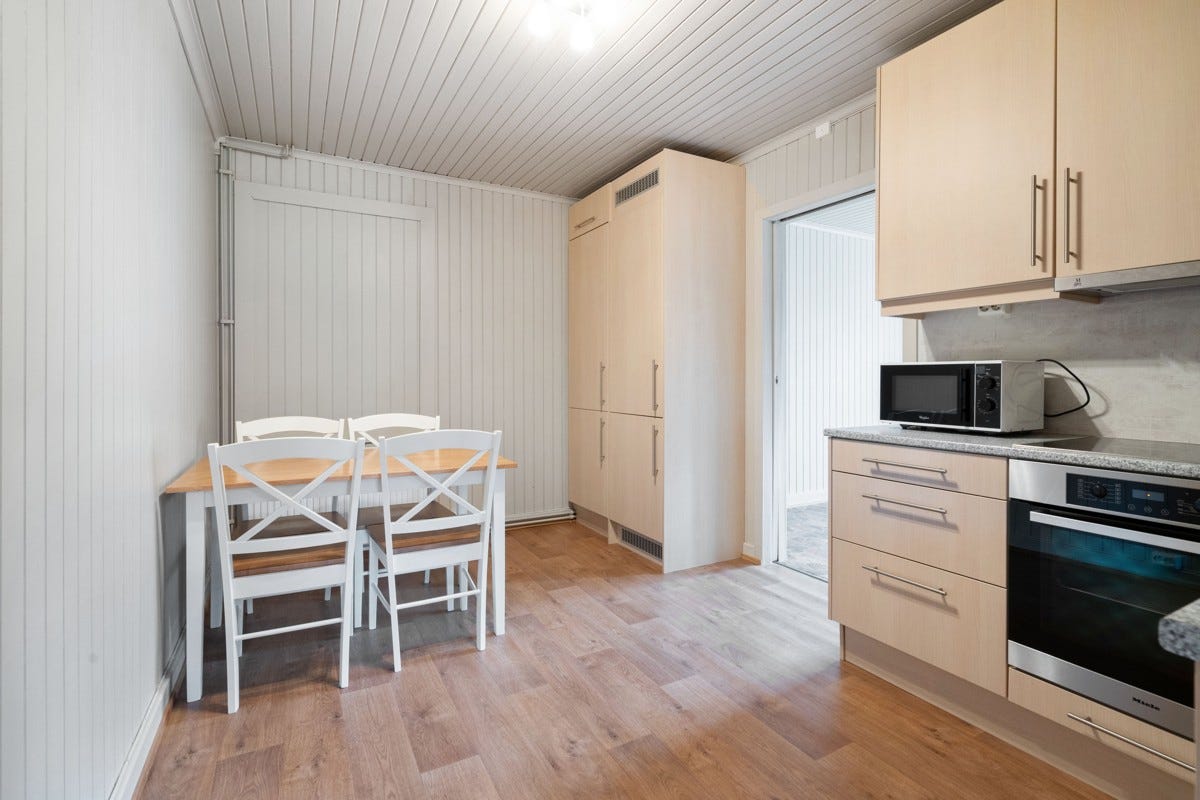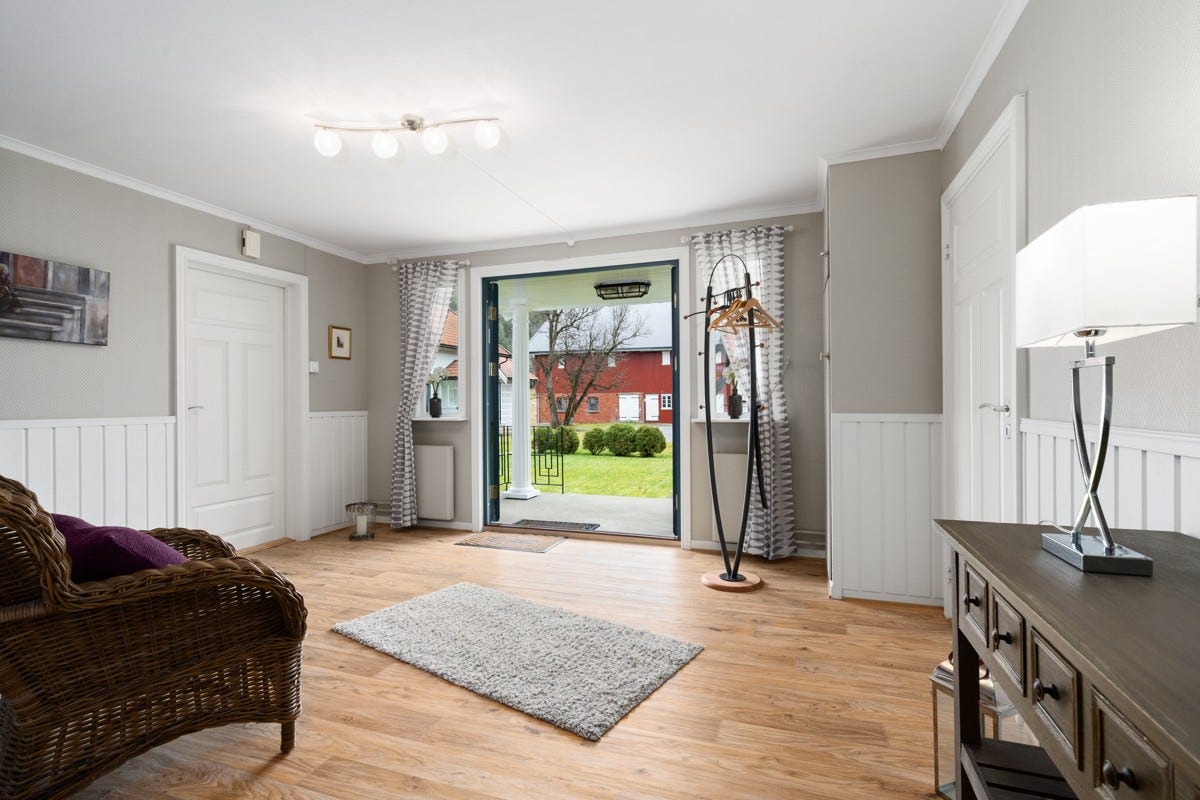 samtidig med kjøkkenet. Hovedinngang: det er tapet med brystningspanel og belegg på gulvet. I himling