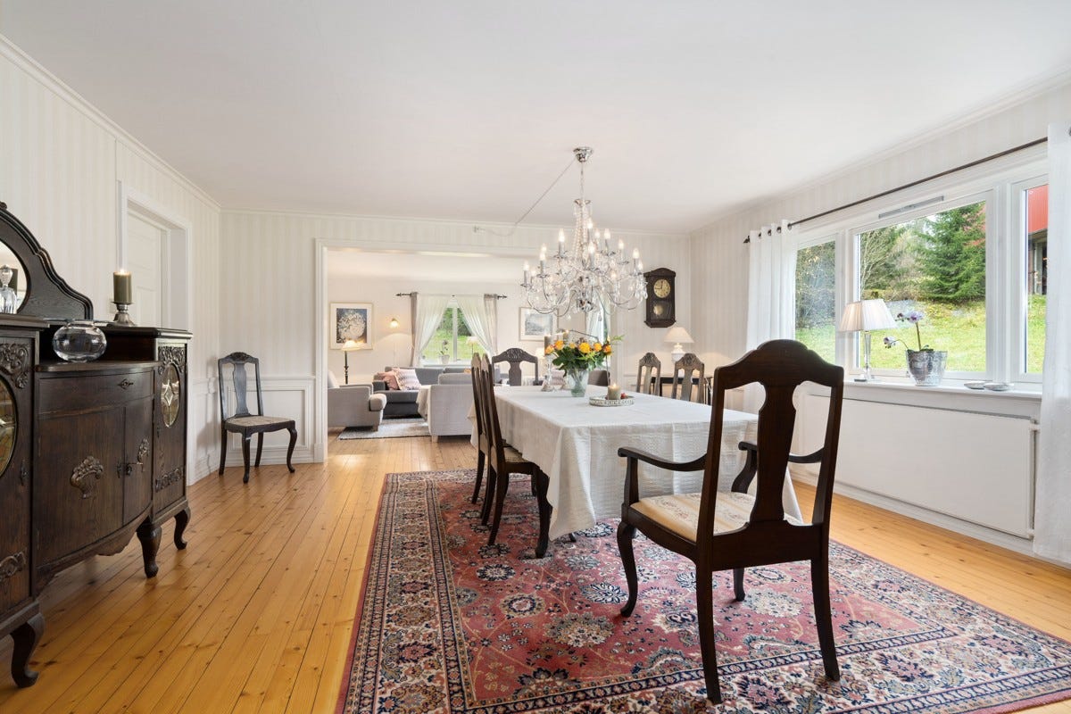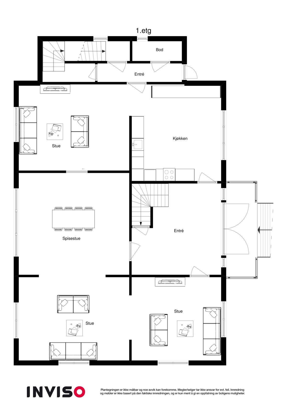 1.etg: Stue, kjøkken, entre, gang, finstue og matbod.