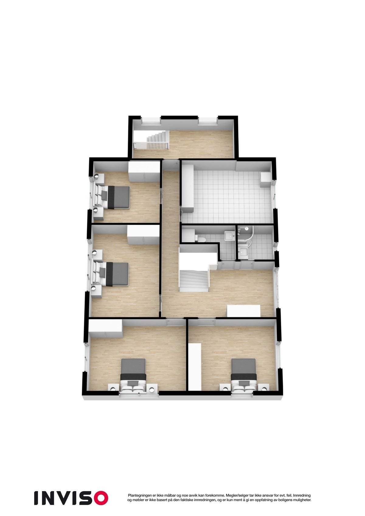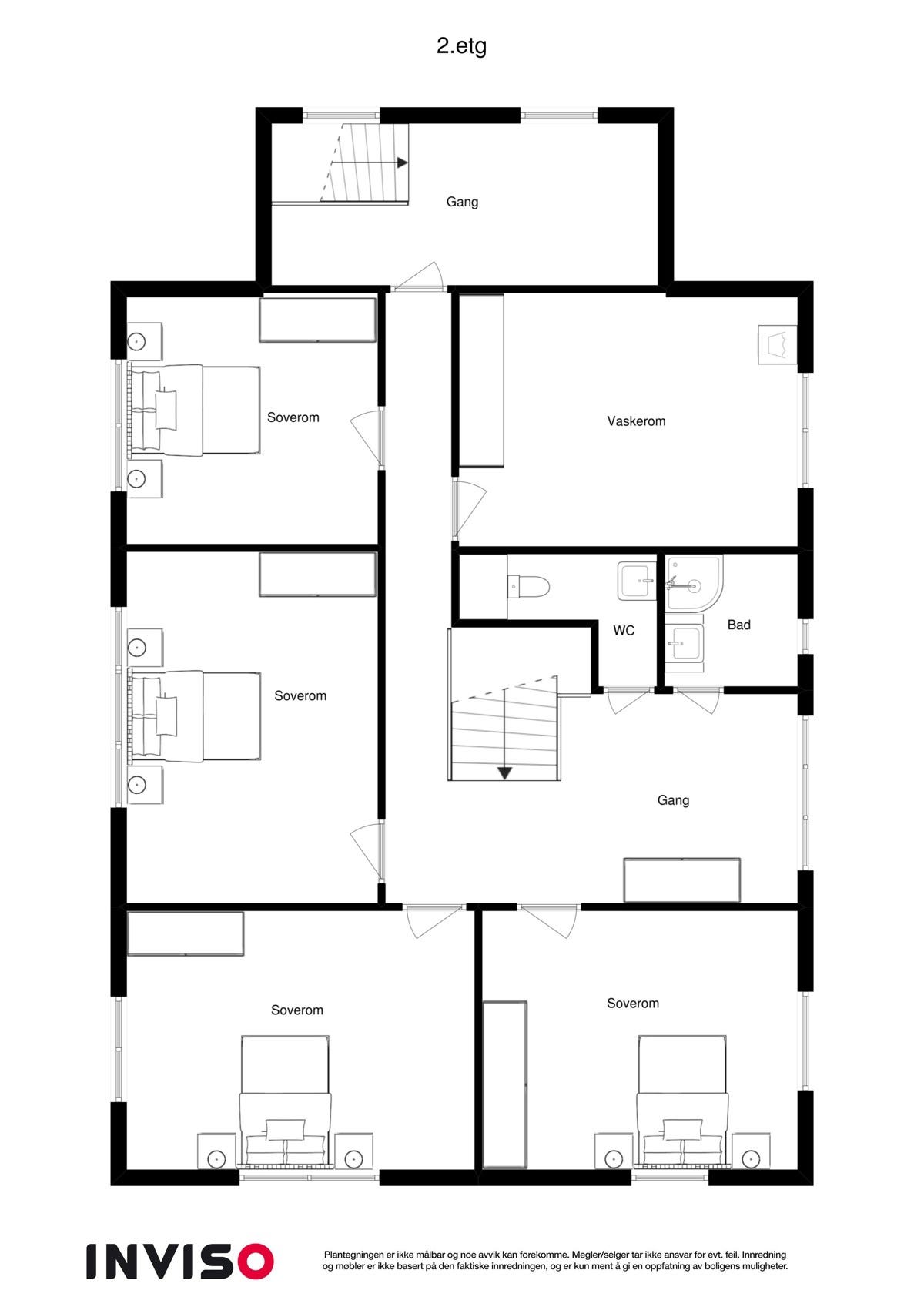 2.etg: 3 soverom, bad, toalett, vaskerom, stue, gang, kontor.