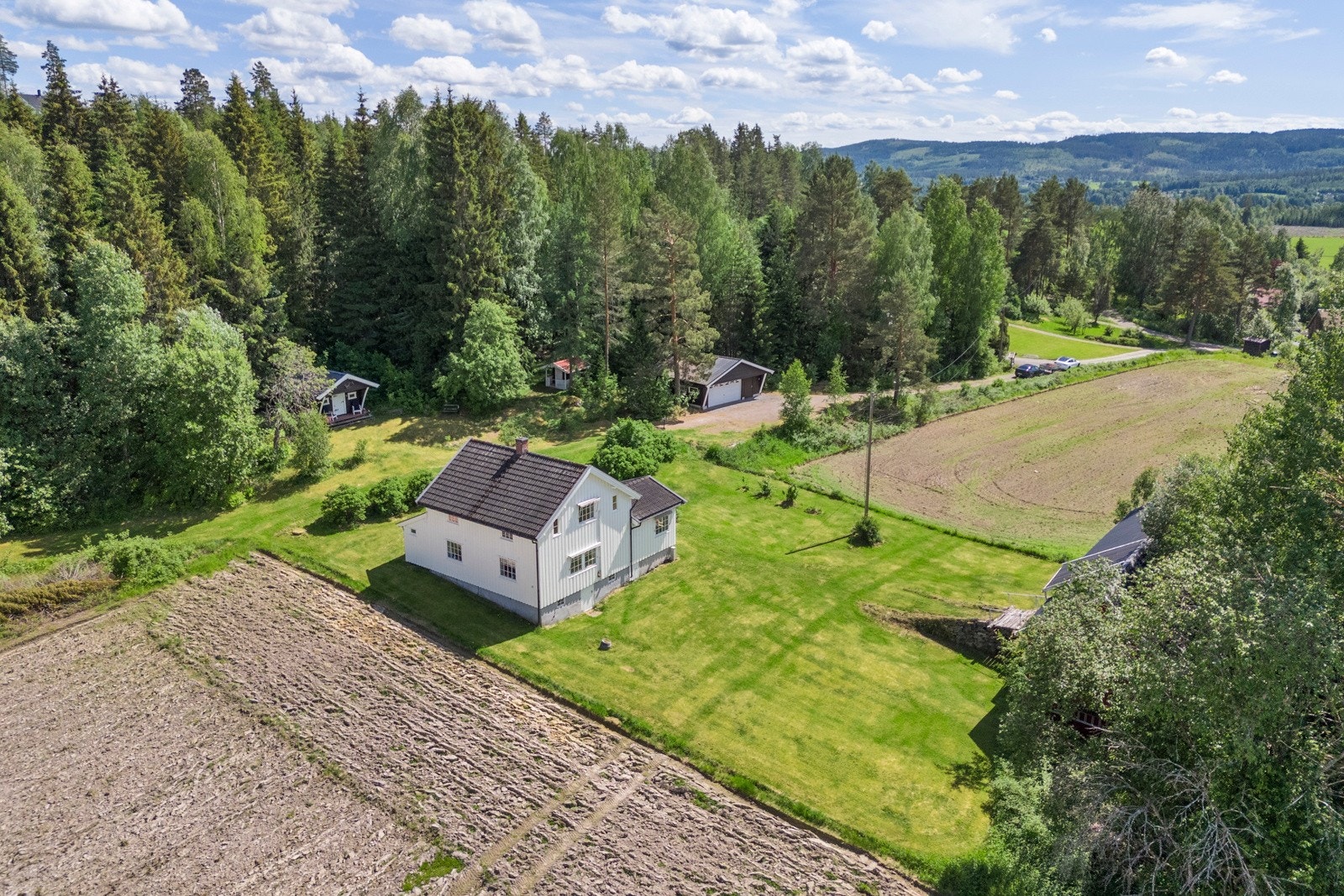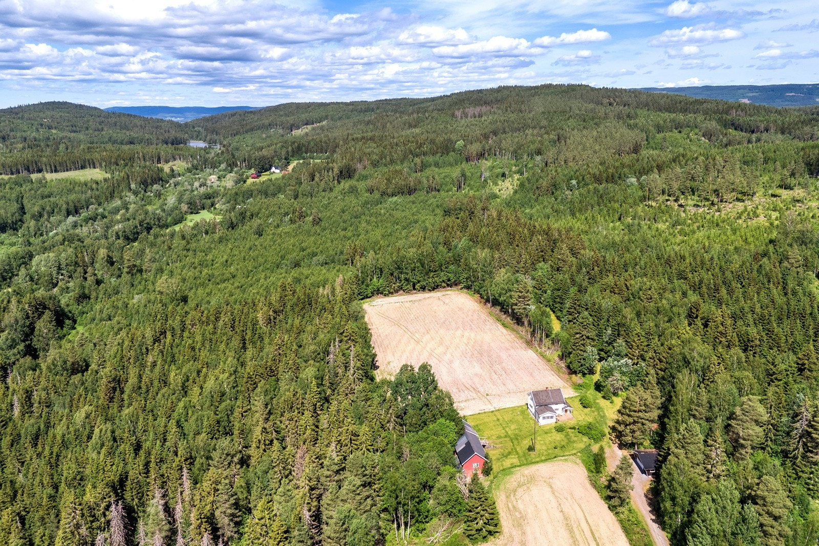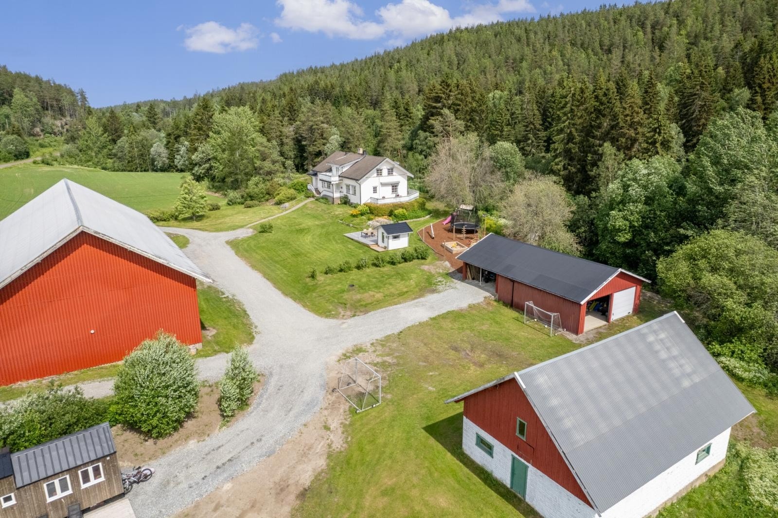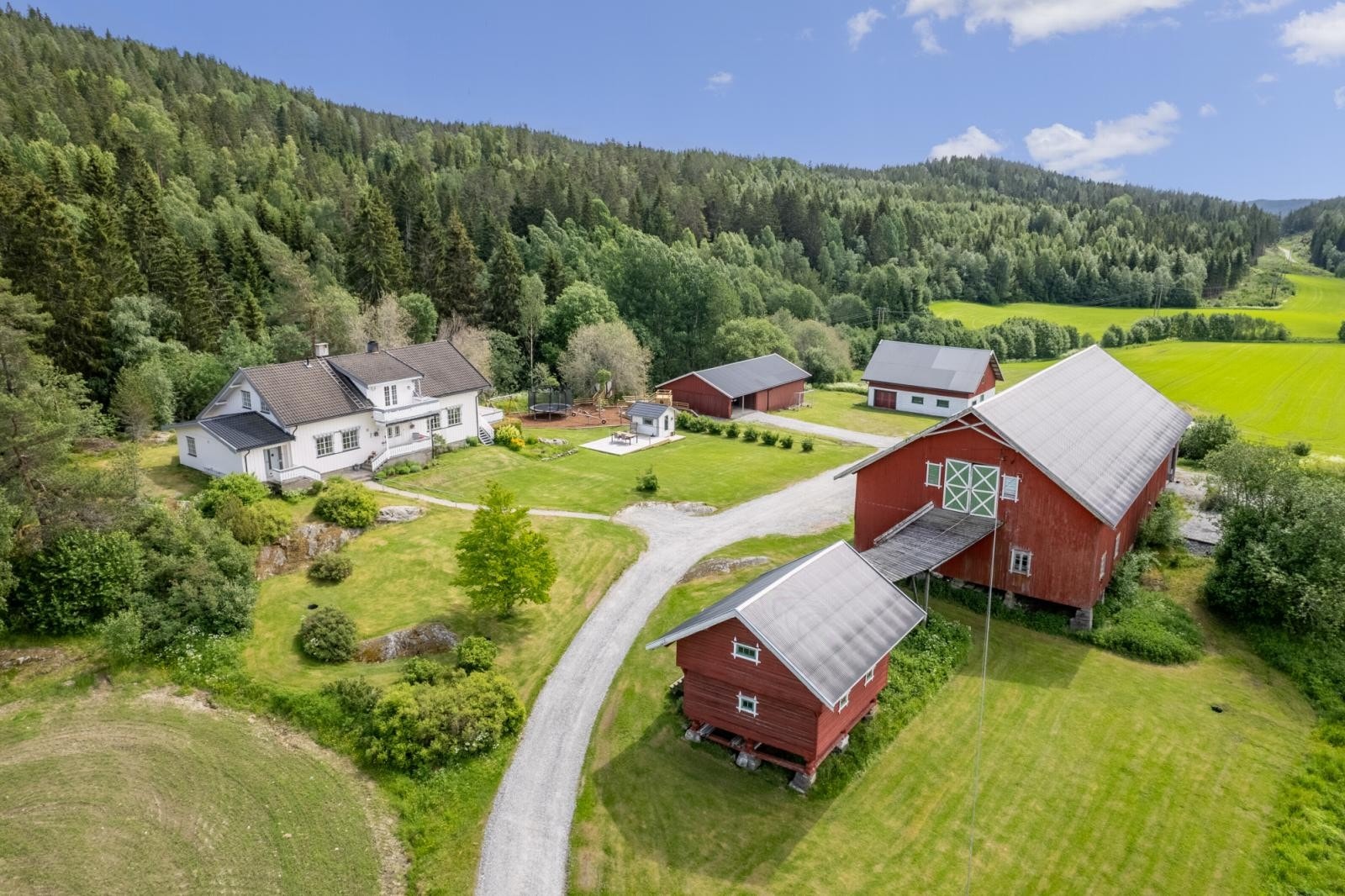 Gårdstunet omkranses av åpne dyrkede arealer og er helt privat. På eiendommen er det oppført fritidsbolig, låve, garasje, stabbur og lekestue.