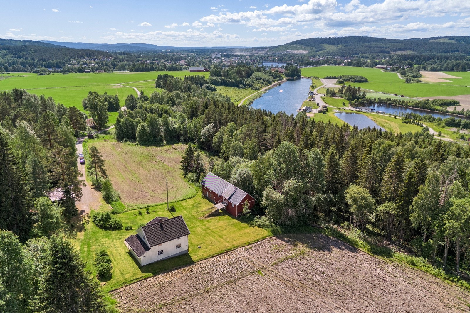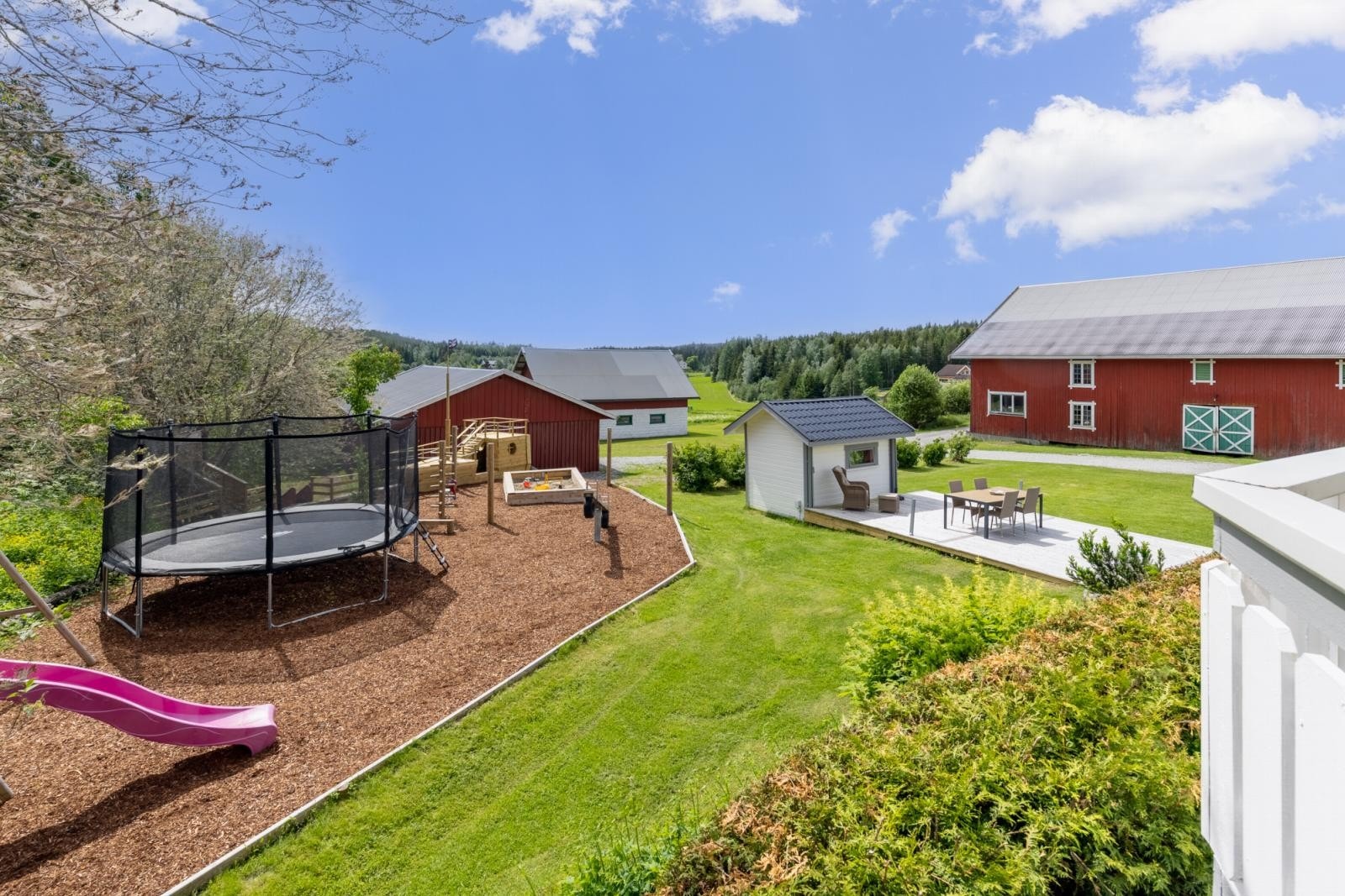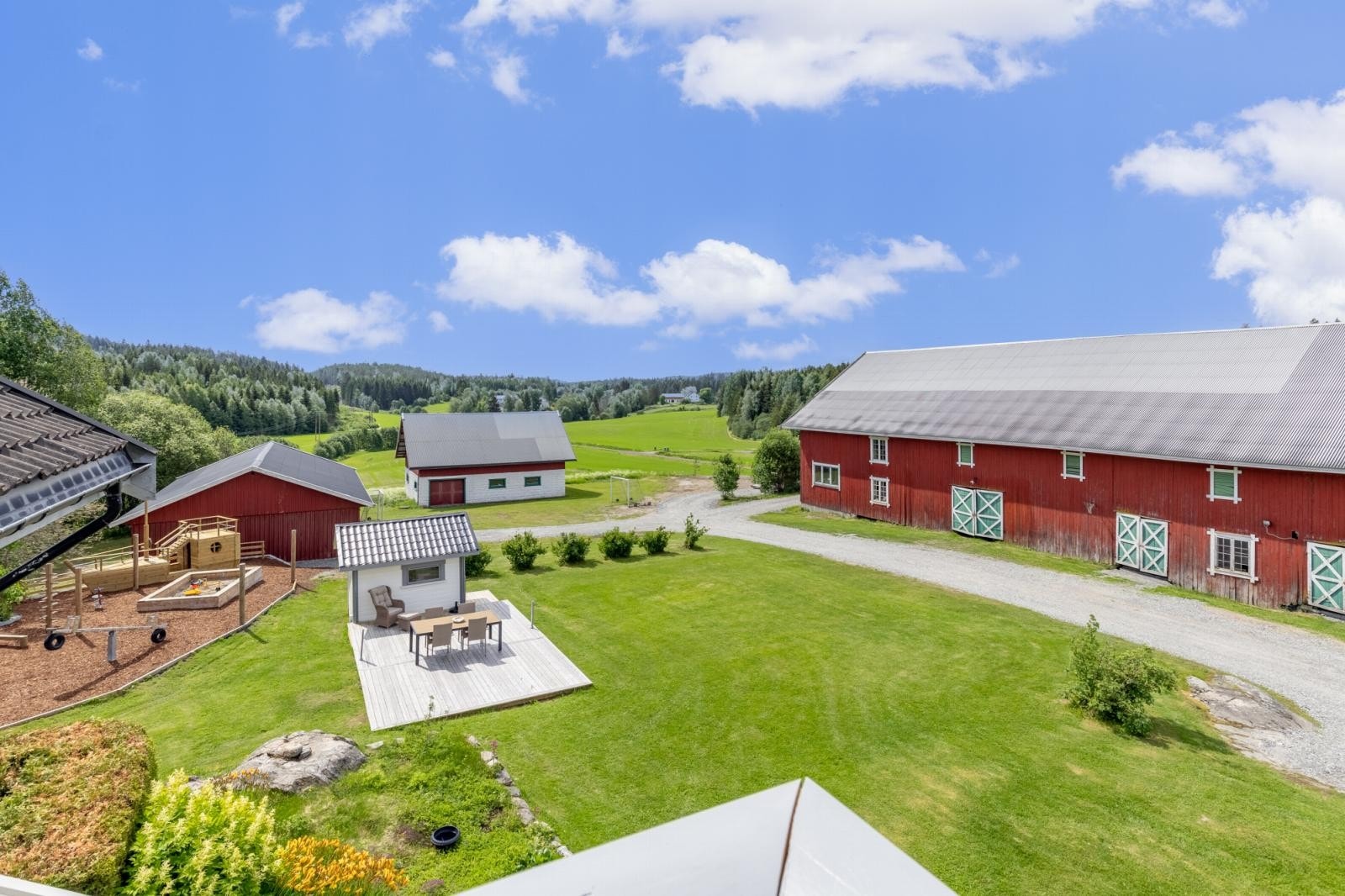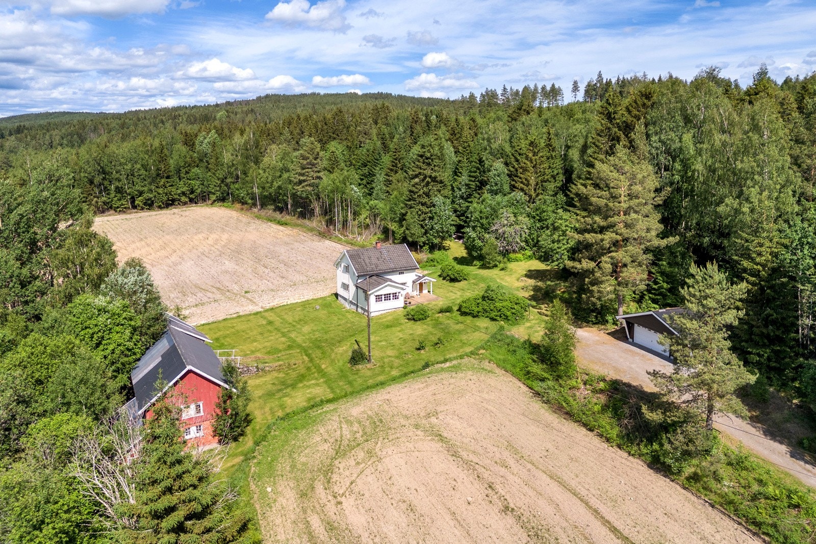 Gårdstunet omkranses av åpne dyrkede arealer og er helt privat. På eiendommen er det oppført fritidsbolig, låve, garasje, stabbur og lekestue.
