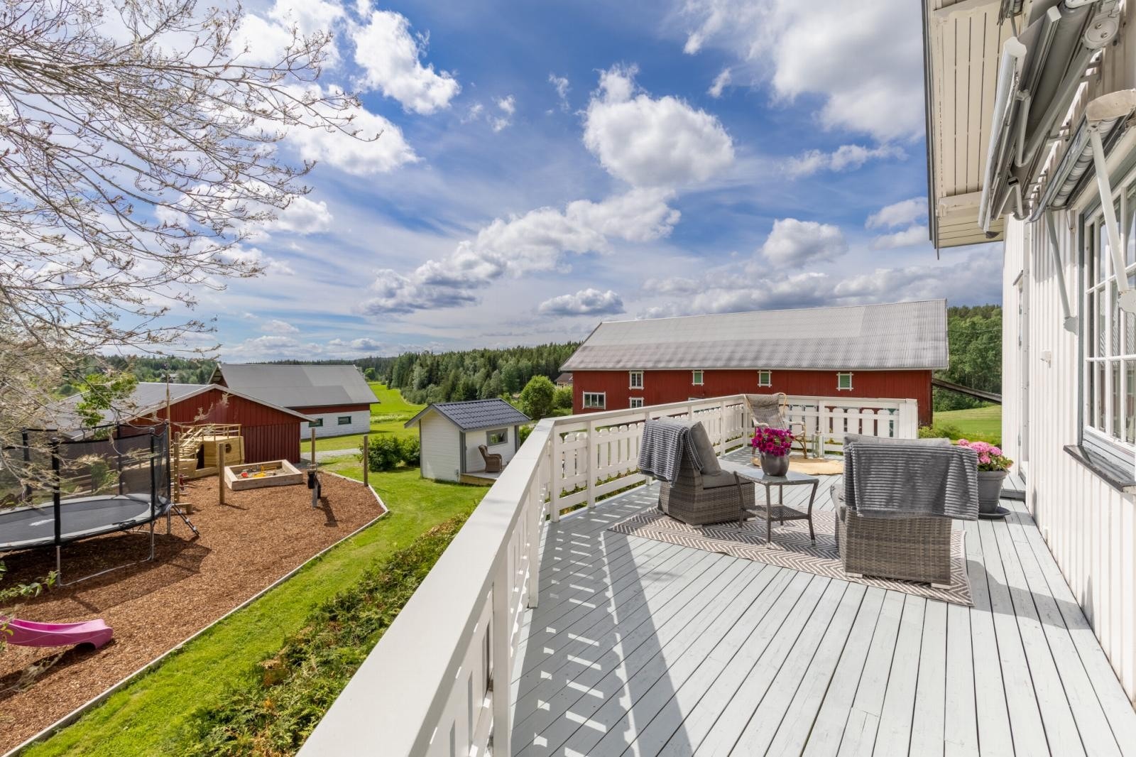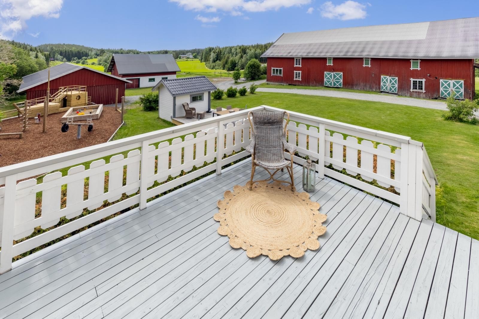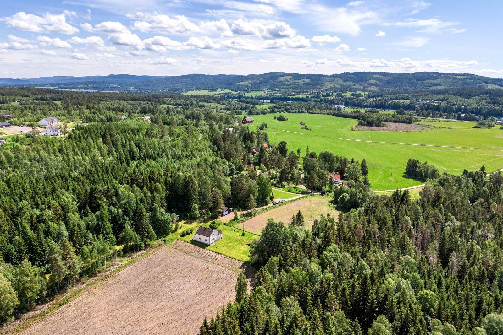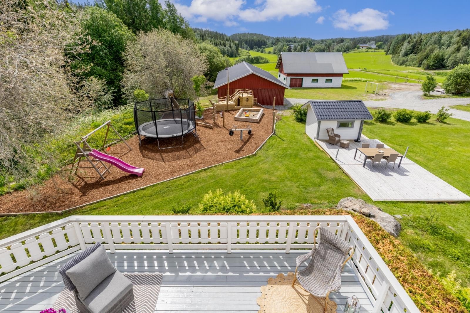 Gårdstunet omkranses av åpne dyrkede arealer og er helt privat. På eiendommen er det oppført fritidsbolig, låve, garasje, stabbur og lekestue.