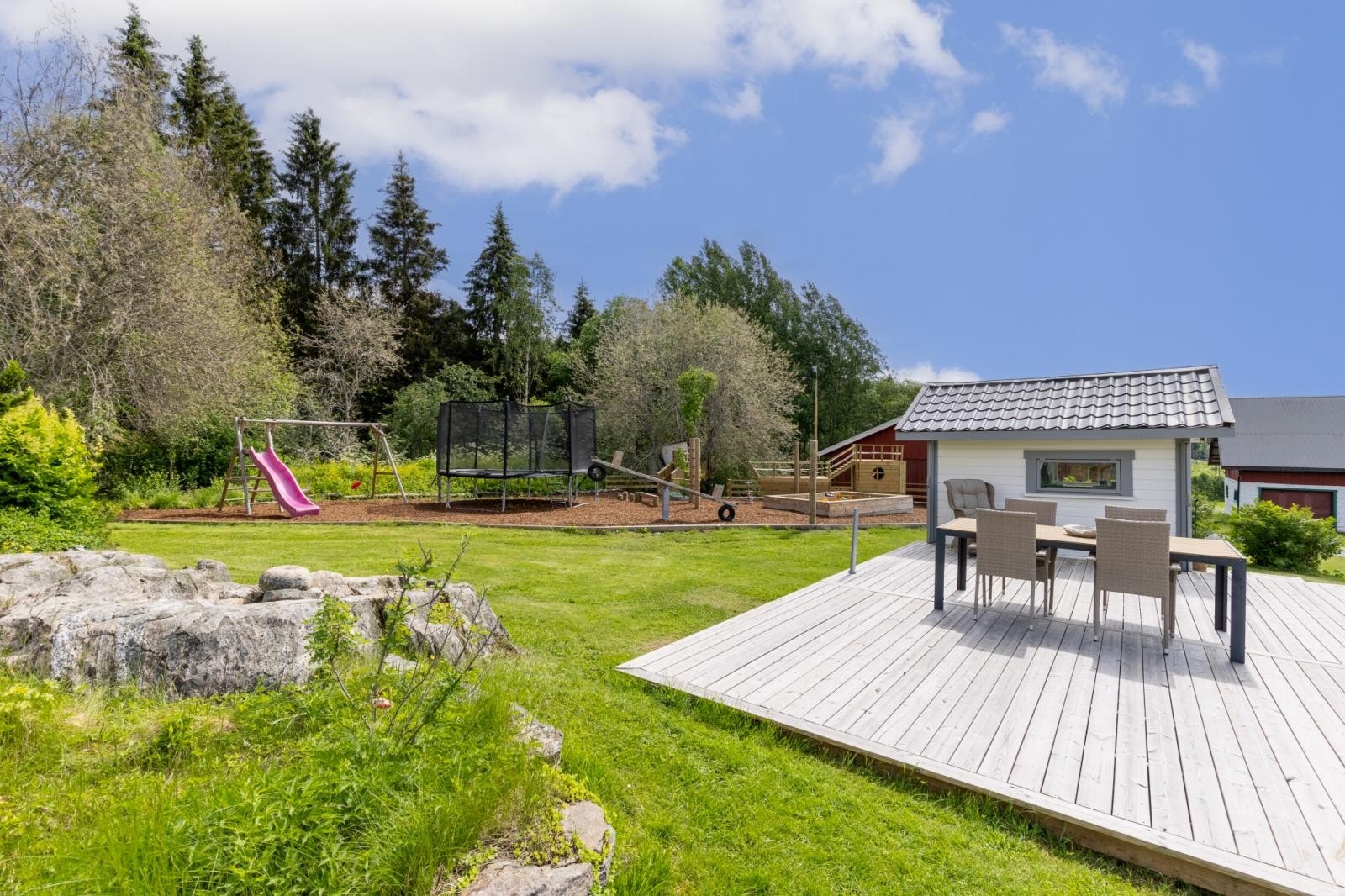 De øvrige bygningene er et stabbur, garasje og lekestue.