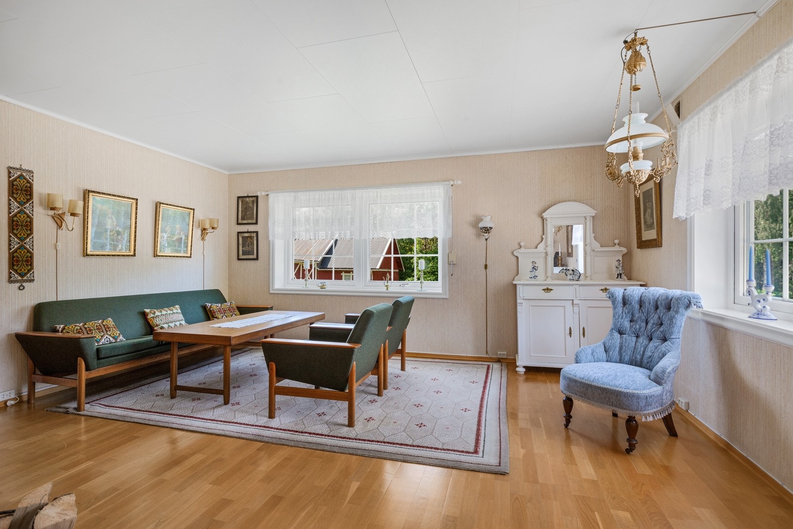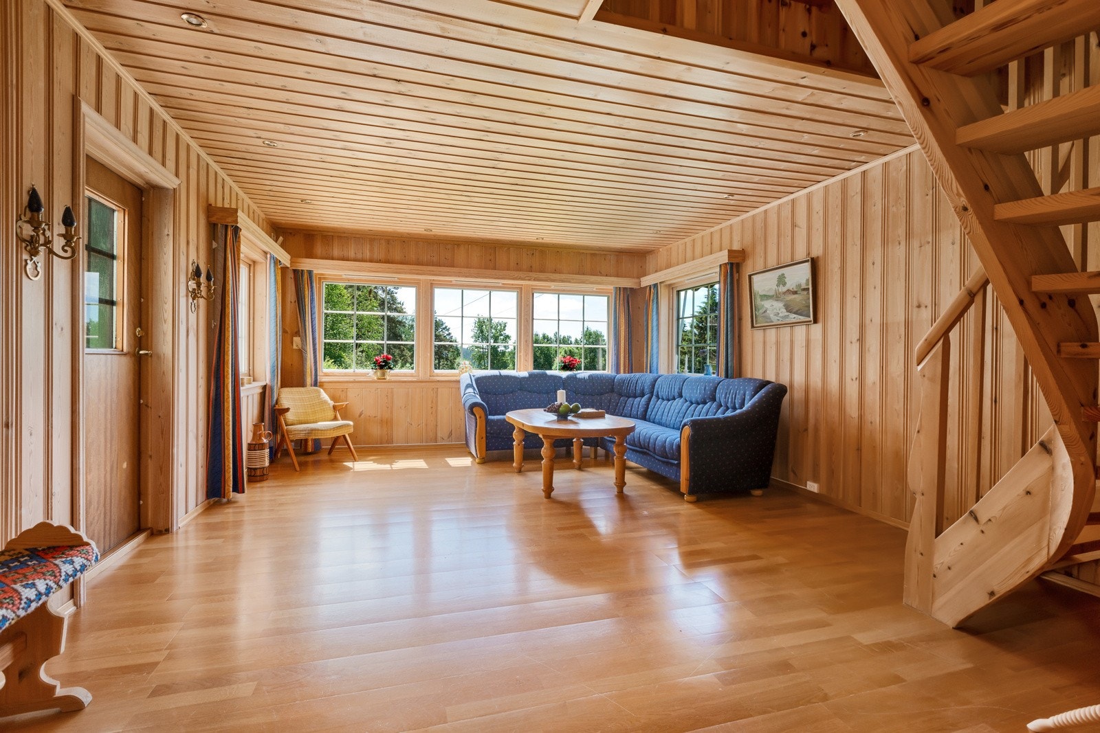 Boligens 1. etasje består av vindfang, kjøkken, 3 stuer og bad. Andre etasje består av gang, 3 soverom og kott.