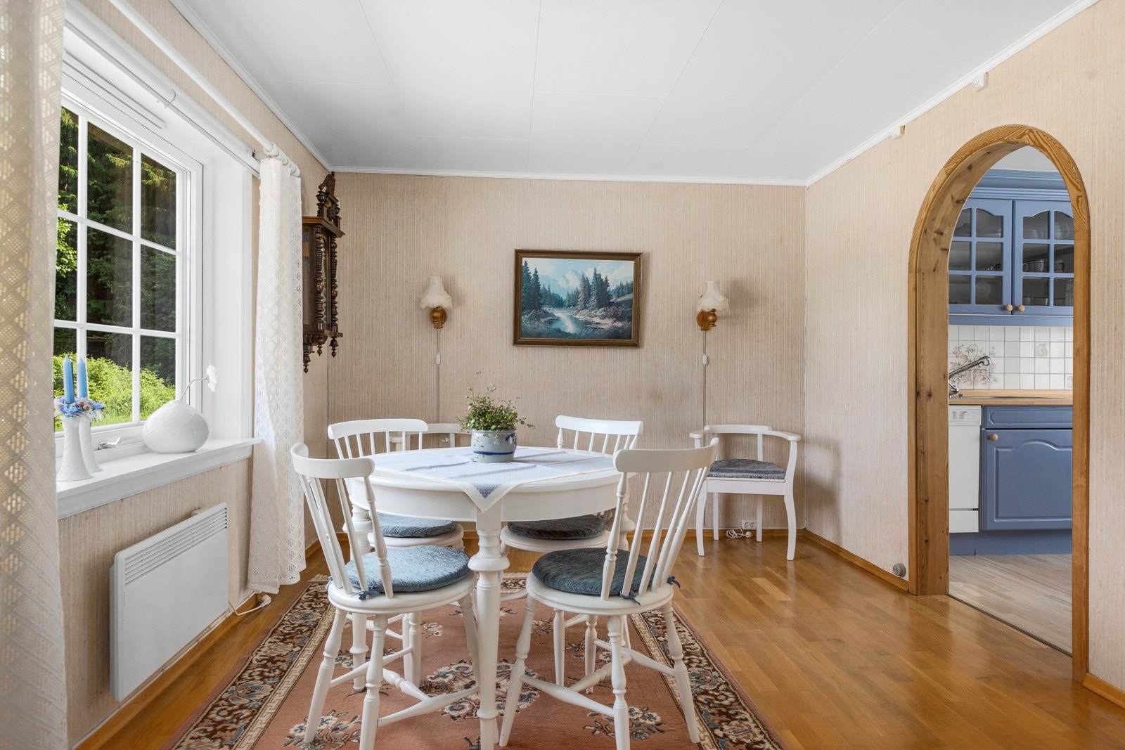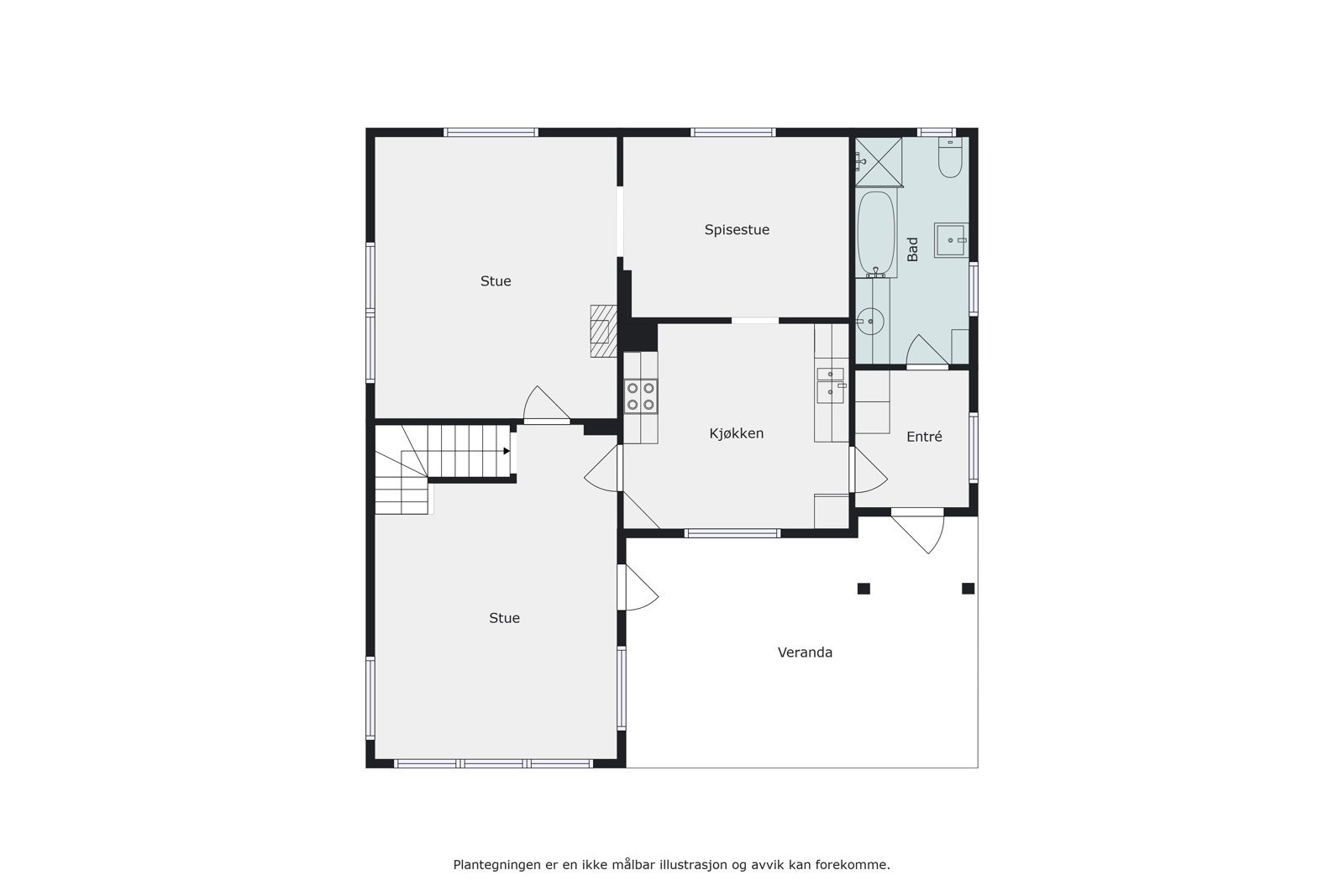 1. etasje: Vindfang, kjøkken, 3 stuer og bad.