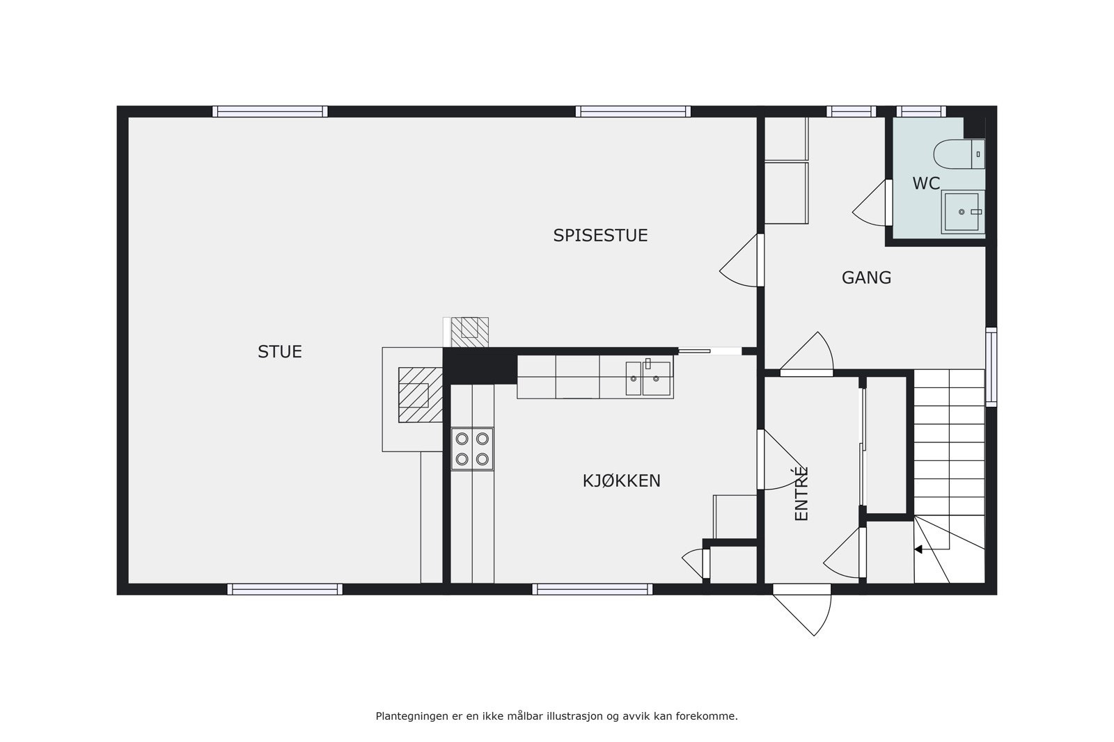 1. etasje primærrom: Vindfang, kjøkken, stue, gang og separat wc.