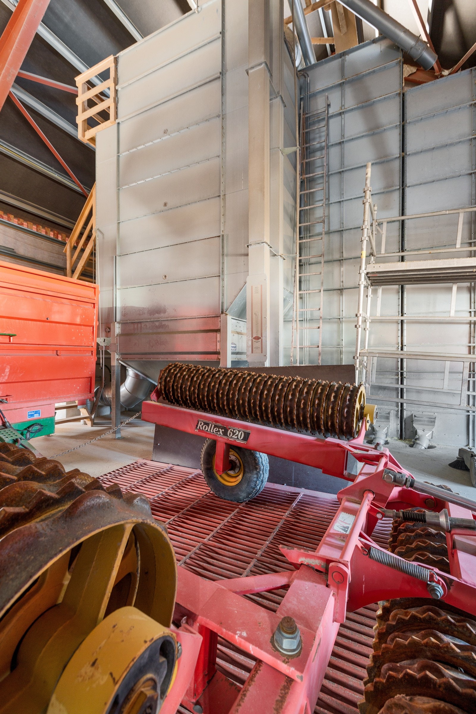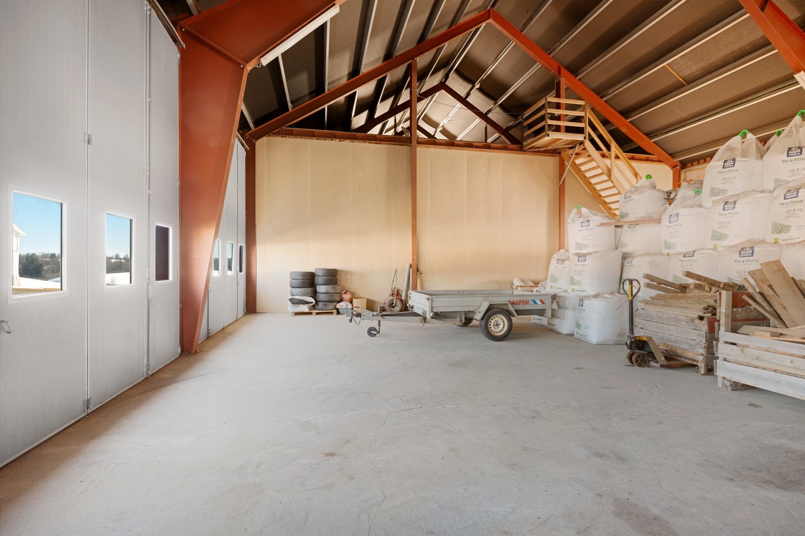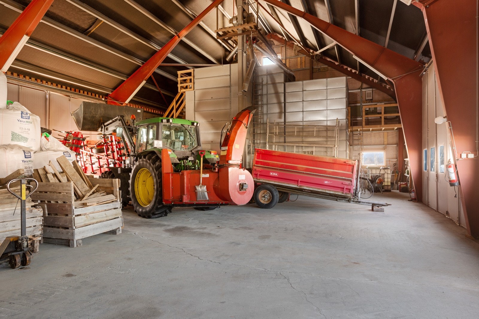 Den nevnte driftsbygningen har en grunnflate på 570 kvm og ble oppført i 2002, ta gjerne en titt på 360 linken over. I nordre fløy er det installert en Tornum varmluft satstørke med rullering og dieselfyr på 150 kw. Anlegget har tilhørende lagersiloer på 80 kbm. og effektiv tippesjakt med gjennomkjøring for maksimal effektivitet og redusert ulykkesrisiko. Det er skruer i sjakta og 40 tonns elevator. I samme del av bygningen har man et større vognskjul med adkomst via tre store foldeporter med en lysåpning på over 4 meter i høyden. Søndre del av driftsbygningen består av et isolert verksted og et isolert redskapsrom på tilsammen ca. 260 kvm. Verksted og redskapsrom varmes opp med slynger i betongdekke og har adkomst via to isolerte leddheisporter og to gangdører. I mesaninen som ligger over de isolerte arealene er etablert teknisk rom for leietagere på deler av arealet. Dette er gode langsiktige leieavtaler som gir en årlig brutto leie på kr 95.000,-