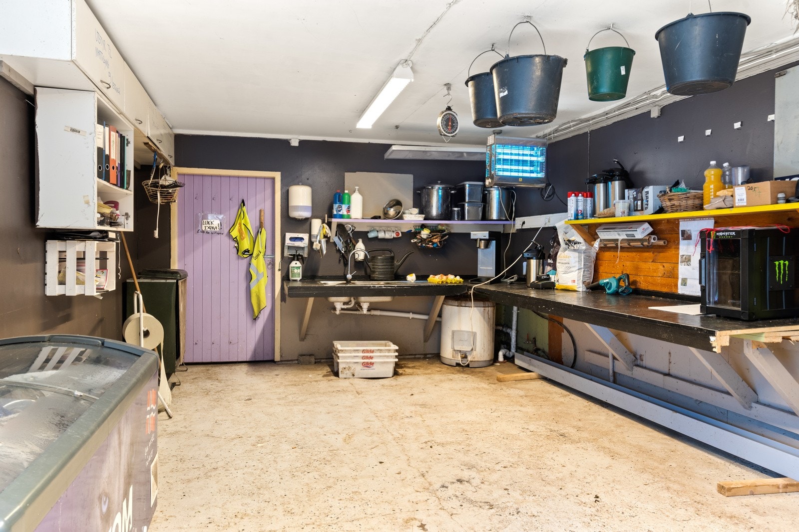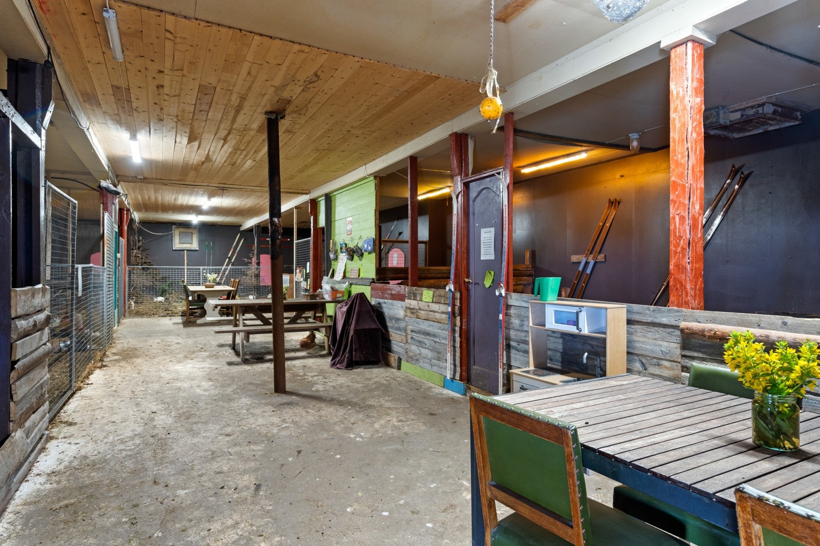 Stall/utgang for hest, redskapsrom, hønehus og rom for kyllinger og kaniner. Pakkerom for egg og selarom for hest. Rom for inntak for vann og trykktank for borevann.