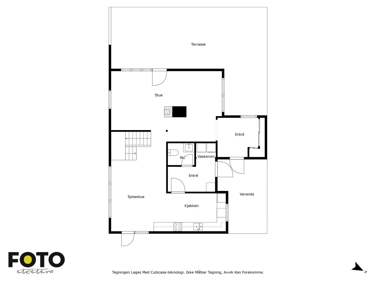Vindfang, stue, spisestue, kjøkken, toalett og vaskerom/sideinngang.