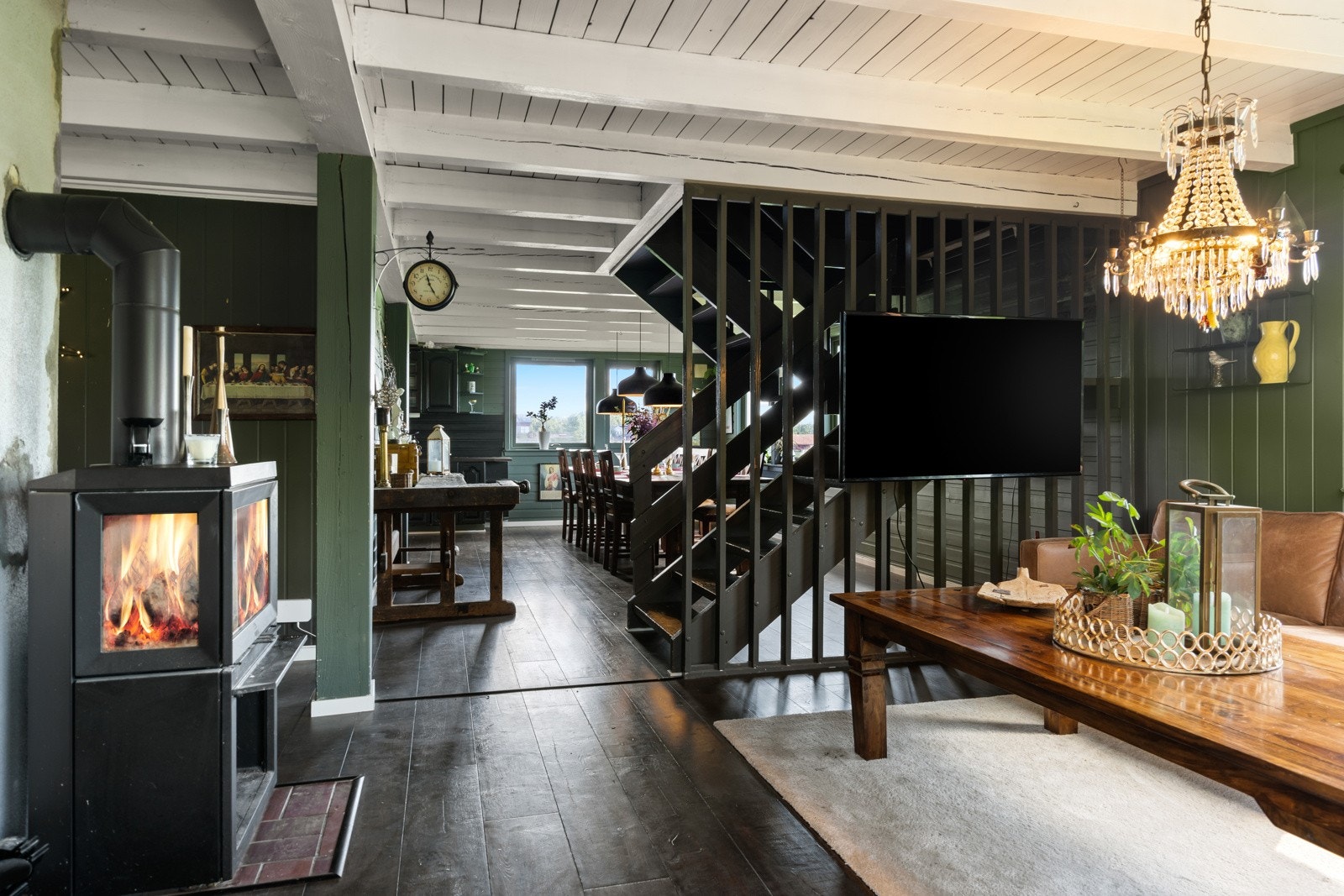 Peisovn i stue. Varmekabler på kjøkken og vaskerom/sideinngang.